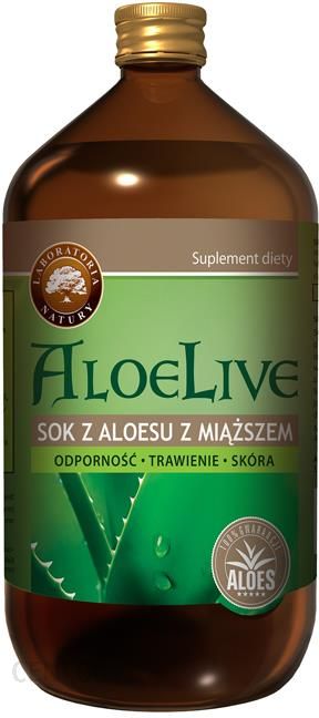 Cenisz sobie naturalne , tradycyjne i sprawdzone sposoby dbania o zdrowie? AloeLive jest produktem dla Ciebie. To w 99,7% czysty sok z aloesu, który wspomaga prawidłowe trawienie, wspiera odporność organizmu oraz poprawia wygląd skóry, odżywiając ją od środka. To połączenie efektywności z delikatnością działania.Aloes zawiera ponad 200 substancji aktywnych, takich jak: acemannan (aloeverosa), aminokwasy, enzymy, witaminy i minerały oraz przeciwutleniacze. Natura dobrała je w doskonałych proporcjach, aby wzajemnie  uzupełniały swoje działanie i pozytywnie wpływały na organizm.AloeLive to produkt, którego jakość została potwierdzona certyfikatem IASC (Międzynarodowa Rada ds. Aloesu). Certyfikat IASC potwierdza zawartość substancji aktywnych i czystość soku z aloesu.Pierwsze  wzmianki o stosowaniu aloesu pochodzą sprzed ponad 4 tysięcy lat! Są to receptury odnalezione na sumeryjskich tabliczkach i egipskich papirusach. Zalety aloesu są cenione na całym świecie. W domach prawie całej Europy hodowano aloes w doniczkach      i nazywano go „rośliną pierwszej pomocy”, a czasem „lekarzem w doniczce”.Od stuleci zalecano korzystanie z aloesu głównie dla utrzymania dobrego trawienia i poprawy odporności. To jedna z niewielu roślin kompleksowo wpływająca na nasz organizm.W aloesowych liściach odnaleziono ponad 270 substancji! Każda z nich może Ci pomóc. Aloesowe składniki natura dobrała i połączyła w tak wyjątkowy sposób, że wzajemnie się uzupełniają i potęgują swoje działanie. Przyroda sprawiła, że jest to roślina doskonale wspomagająca funkcjonowanie, nadwyrężonego złym odżywianiem, układu trawiennego. Bogactwo substancji zawartych w soku z aloesu wspiera prawidłową pracę systemu odpornościowego.  Naturalny sok z aloesu działa niezwykle delikatnie (bez skutków ubocznych) ale z ogromną mocą – szybko i skutecznie.Występowanie:Przypuszcza się, że aloes pierwotnie występował na suchych, gorących terenach Afryki i Azji Mniejszej, skąd „zawędrował” do Grecji, Rzymu, na Daleki Wschód i do obu Ameryk. Ponieważ jest stosunkowo mało wymagający i łatwo przystosowuje się do nowych warunków, obecnie występuje prawie na całym świecie. Rośnie dziko, hodowany jest jako ozdobna roślina doniczkowa, a również uprawiany na skalę przemysłową.Uprawy:Pierwsza plantacja aloesu została założona w 1945 roku na wyspie Barbados. Od tamtego czasu powstało ich wiele m.in. w Stanach Zjednoczonych i w Australii.Aloes wykorzystywany w produktach Laboratoria Natury pochodzi z wybranych, tradycyjnych plantacji zlokalizowanych na pograniczu Meksyku i Teksasu. Warunki panujące w tym regionie – ogromne nasłonecznienie, niewielkie odpady deszczu – powodują, że hodowane tam aloesowe rośliny są bardzo bogate w najważniejsze prozdrowotne składniki.Międzynarodowa Rada Naukowa ds. Aloesu podkreśla  dlaczego konsumenci powinni szukać Pieczęci Aprobaty IASC na produktach, w których składzie zawarty jest aloes.Skład:sok aloesowy – 99,7%, regulator kwasowości: kwas cytrynowy,substancje konserwujące: benzoesan sodu, sorbinian potasu.Przechowywanie:Przechowywać w miejscu niedostępnym dla małych dzieci. Chronić przed bezpośrednim działaniem promieni słonecznych. Po otwarciu przechowywać w lodówce nie dłużej niż 1 miesiąc.Sposób użycia soku aloesowego:50 ml (5 łyżek) dziennie, na godzinę przed posiłkiem.Należy rozcieńczyć przed spożyciem wodą lub sokiem owocowym w stosunku 1:1.Korzystny efekt wynikający z deklarowanego działania występuje w przypadku spożycia 50 ml (5 łyżek) soku dziennie.Przed użyciem wstrząsnąć.Maksymalna porcja dzienna  zawiera 49,8 ml czystego soku z aloesu.Nie należy przekraczać zalecanej porcji do spożycia w ciągu dnia.Suplement diety nie może być stosowany jako substytut (zamiennik) zróżnicowanej diety