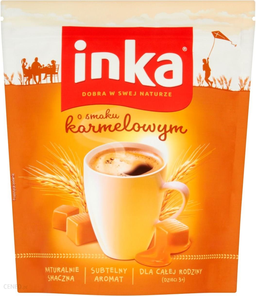 Sposób przyrządzenia:Wsyp do kubka 2 łyżeczki Inki (4 g).Zalej gorącą, ale nie wrzącą wodą (200 ml), a jeszcze lepiej mlekiem. Zamieszaj!Szczelnie zamknięte opakowanie przechowywać w suchym i chłodnym miejscu.Naturalnie, że każdy kubek Inki karmelowej jest tak smaczny! Oryginalna receptura bazuje na idealnym połączeniu polskiej kawy zbożowej Inka i aromatycznej karmelowej nuty. Kusi zniewalającym smakiem i aromatem, które uprzyjemnią Ci każdą porę dnia lub nocy.Marka Inka powstała w Polsce w 1971 roku. Jej oryginalna receptura opracowana przez polskich naukowców jest stosowana do dzisiaj bez żadnych zmian.Na bazie sprawdzonej receptury Inki Klasycznej powstają kolejne smaki i nowe warianty takie jak: Inki wzbogacone w błonnik, w magnez, w wapń i witaminy, Inka pozbawiona glutenu, Inka z zawartością orkiszu, czy zbóż z certyfikowanych ekologicznych upraw.Inka to lider rynku i marka, która ciągle się rozwija. Stanowi idealne połączenie tego, co jest przyjemne w smaku z tym, co jest lepsze dla Ciebie i Twoich bliskich, bo jest naturalne, proste w składzie.Jest też świetną bazą do tworzenia pysznych napojów dla całej rodziny według własnych pomysłów lub unikalnych przepisów proponowanych przez markę, które znajdziesz na: przepisy.inka.pl.Rozpuszczalna kawa zbożowa z karmelem