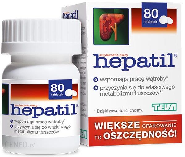 Hepatil – opisHepatil 80 już od 25 lat wspomaga pracę wątroby i przyczynia się do właściwego metabolizmy tłuszczów.1 Hepatil, dzięki zawartości choliny wspomaga pracę wątroby i przyczynia się do właściwego metabolizmu tłuszczów. Zaleca się jego przyjmowanie przy spożywaniu posiłków o dużej zawartości tłuszczu, którymi wątroba może czuć się obciążona. Zaufaj marce Hepatil, która wspomaga wątroby Polaków już od ponad 25 lat! Zalecane dawkowanie: U dorosłych i u dzieci powyżej 7 roku życia. 1-2 tabletki 3 razy na dzień, popijając niewielką ilością wody. Jest dostępny w dwóch rozmiarach opakowań: 40 i 80 tabletek. Suplement diety. 1 dzięki zawartości choliny