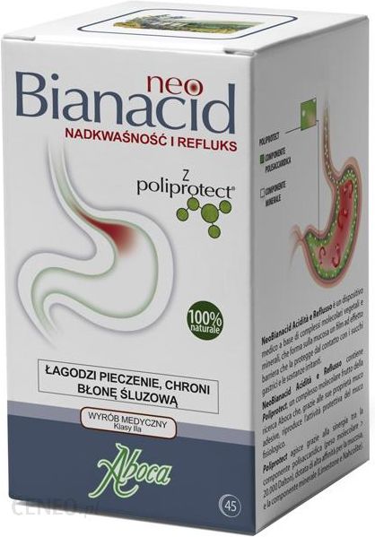 NeoBianacid Nadkwaśność i Refluks jest wyrobem medycznym na bazie roślinnych i mineralnych kompleksów molekularnych, który tworzy na błonie śluzowej warstwę o efekcie bariery, chroniącej błonę przed kontaktem z sokami żołądkowymi i substancjami podrażniającymi. Zawiera poliprotect, kompleks molekularny, który dzięki swym właściwościom odtwarza ochronne działanie śluzu fizjologicznego.